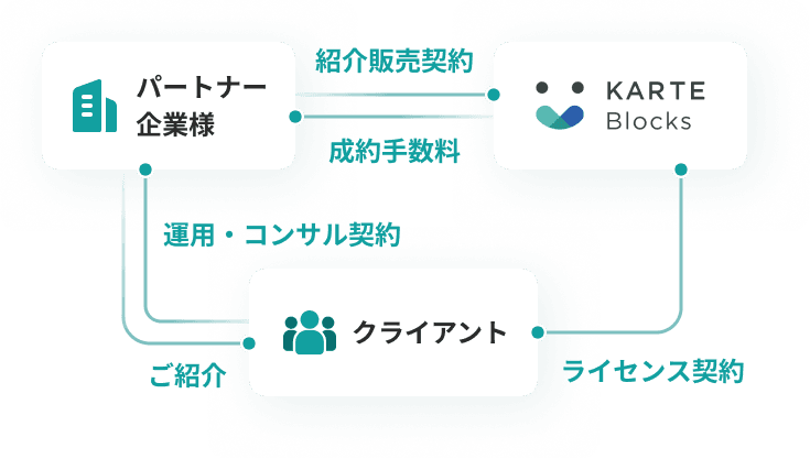 貴社と弊社間では、紹介販売契約を締結。KARTE Blocksの成約に至った際に手数料をお支払いいたします。クライアントと運用・コンサル契約を結ぶことで、自社独自メニューの開発や既存事業とのシナジーを生み出すことも可能です。